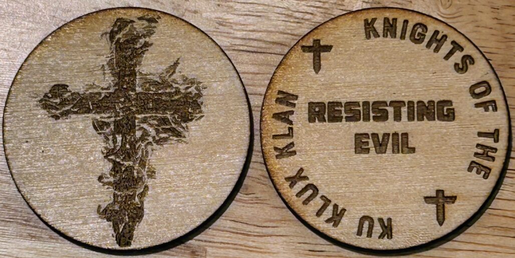 1.75 inch wooden coin. Laser engraved with a burning cross on the front and “RESISTING EVIL” on the back.